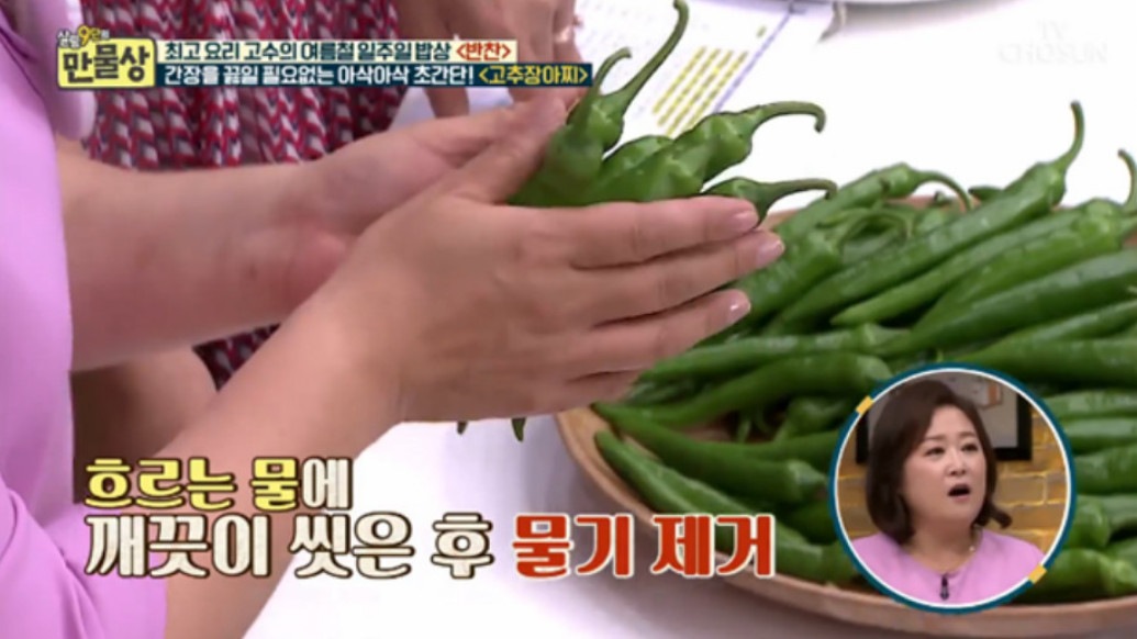 1. 먼저 고추를 손질해야 해요. 흐르는 물에 고추를 깨끗하게 씻은 다음, 물기를 잘 제거해 주세요. 그런 다음, 고추의 끝부분을 잘라줍니다. 오늘 만드는 장아찌 레시피에서 이 단계가 중요해요. 고추 끝부분을 잘라주면 나중에 먹을 때 장아찌 국물이 튀는 걸 막을 수 있다고 해요.