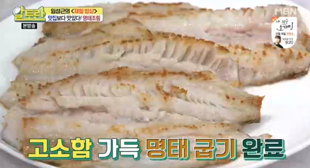 속살부분이 익으면 뒤집어서 껍질이 있는 등부분도 노릇노릇하게 구워주세요. 이렇게 명태를 조리기 전에 먼저 구워주시면 조릴 때 명태살이 부서지기 않고 고소한 맛이 증가되며 비린내도 제거된다고 합니다.