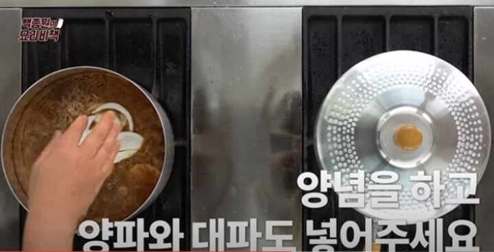 양파와 대파를 넣고, 20분 정도 더 끓여주세요. 대파의 파란 부분은 고명으로 사용할 예정이니 조금 남겨두세요.