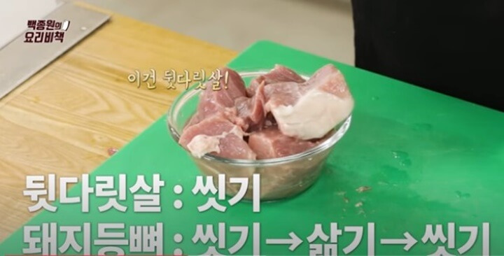 돼지고기 뒷다리살을 큰 덩어리로 적당하게 썰어주세요. 뒷다리살이라 해도 등뼈처럼 큼직하게 썰면 비슷한 모양이 나요 :) 썰어 놓은 뒷다리살은 흐르는 물에 잘 씻어서 핏물을 제거해 주세요. 등뼈를 사용할 때도 마찬가지로 흐르는 물에 잘 씻어야 해요. 뒷다리살은 씻어서 그릇에 담아두고, 돼지 등뼈는 씻은 후에 초벌로 한번 삶아낸 뒤, 다시 한번 더 씻어야 깨끗해져요.