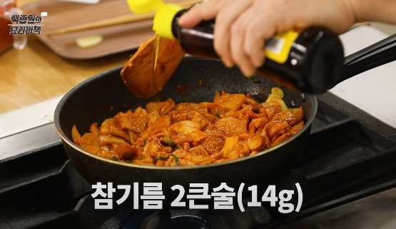 재료가 들어있는 냄비에 식용유 2큰술을 넣고, 간 마늘 1큰술을 추가한 후 잘 섞어가며 볶아주세요.