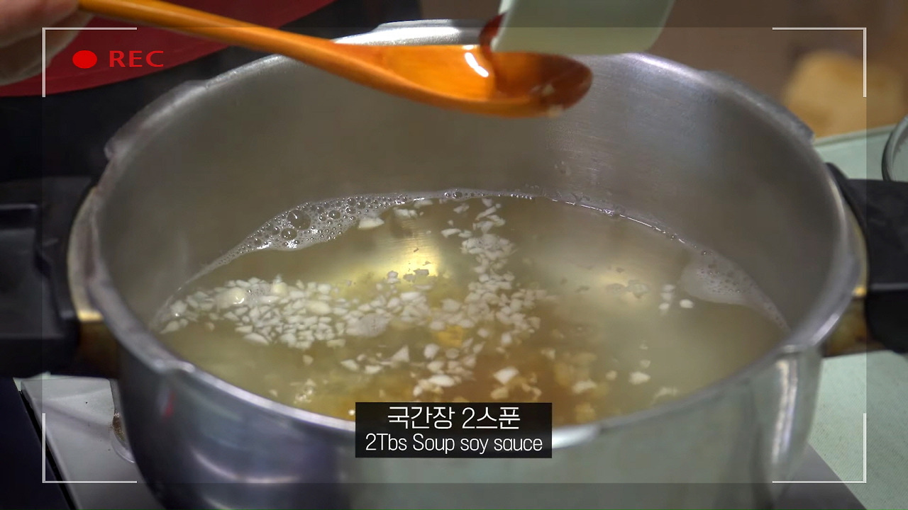 다음은 매생이 굴국에 맛을 더하는 단계다. 끓여둔 매생이 굴국 육수에 다진 마늘 1스푼과 국간장 2스푼을 넣어, 매생이 굴국의 풍미를 한층 끌어올려준다.