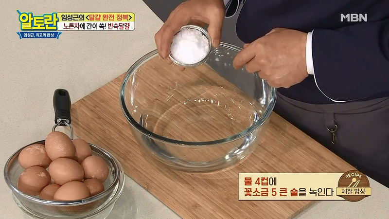 4. 물 4컵에 꽃소금 5큰술을 넣고 잘 녹인 뒤, 삶은 달걀을 4시간 이상 담가 두세요.