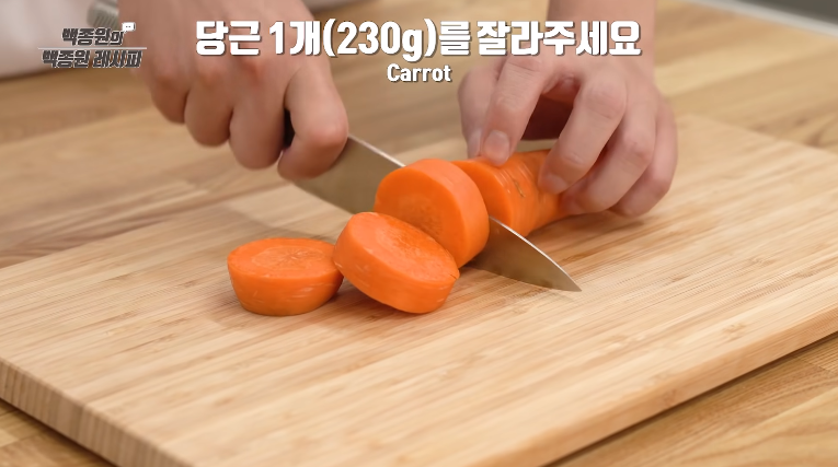 5. 깨끗이 씻은 당근은 약 1cm 두께로 썰고, 대파는 2\~3cm 간격으로 통째로 잘라 준비해 주세요.
