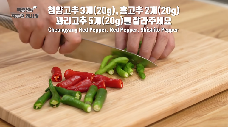 6. 청양고추, 홍고추, 꽈리고추도 준비해 주세요. 고추 크기에 맞춰 1/2 또는 1/3 크기로 썰면 됩니다.