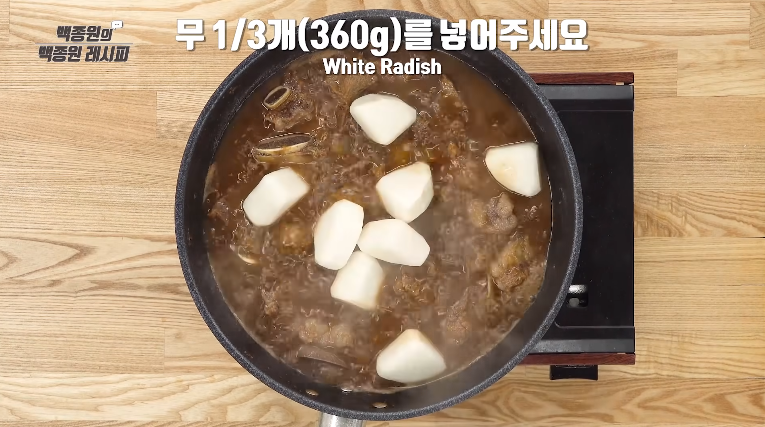 갈비가 부드럽게 익었다고 느껴지면, 그때 무를 넣고 함께 끓여 주세요.