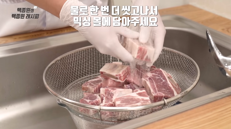 7. 이제 핏기가 어느 정도 빠진 갈비는 깨끗한 물에 한 번 헹궈 주세요.