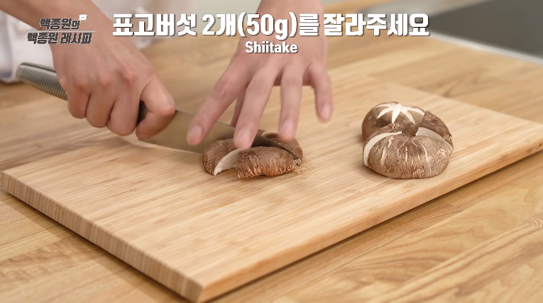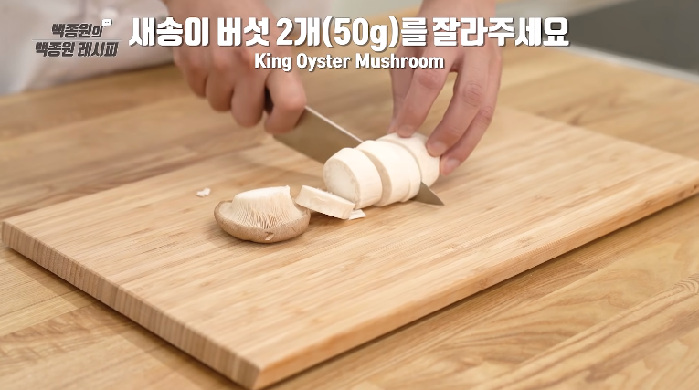 3. 새송이버섯은 밑부분을 다듬은 뒤 약 1cm 두께로 썰고, 표고버섯은 원하는 모양으로 내거나 1/4 크기로 잘라 준비하세요.