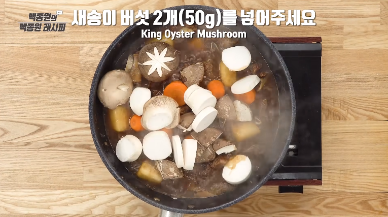 10. 무가 반쯤 익으면 나머지 채소들을 넣어 주세요. 당근, 표고버섯, 새송이버섯을 넣고 잘 익히면 됩니다.