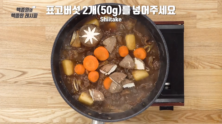 9. 이번 백종원 황금레시피에서는 소갈비를 미리 삶지 않고, 모든 재료를 한 번에 넣어 간편하게 조리할 수 있게 했습니다. 깨끗하게 씻은 소갈비에 갈비 양념과 물 1L를 넣고 끓여주세요. 물이 끓기 시작하면 중불로 줄여 약 1시간 정도 끓이면 됩니다.