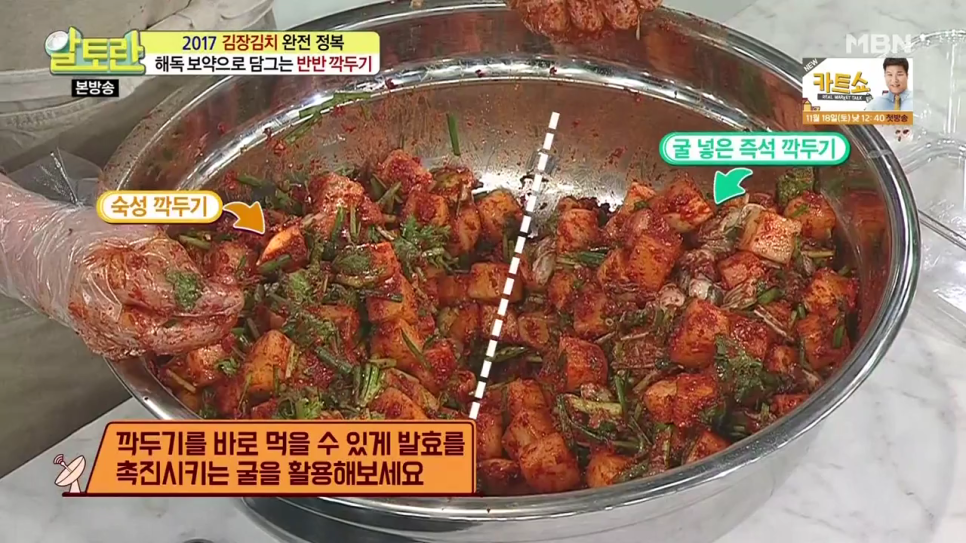 알토란 깍두기는 굴이 들어가 시원한 맛을 내며, 바로 먹는 버전과 숙성시켜 두고 먹는 버전으로 반반 담아봤어요. 영양도 가득! 만들기도 정말 간단해요~쪽파나 미나리 같은 부재료는 없어도 되지만, 맛과 풍미를 위해 가능하면 넣어보세요^^