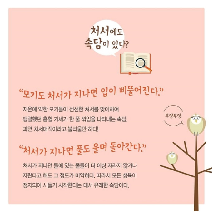 * 처서가 지나면 모기도 입이 비뚤어진다 : 처서의 서늘한 기온 때문에 모기와 파리의 성화가 줄고, 귀뚜라미가 하나둘씩 나오기 시작한다는 의미입니다.