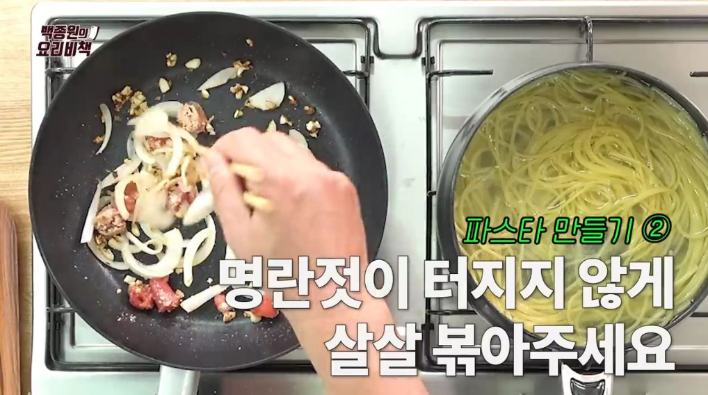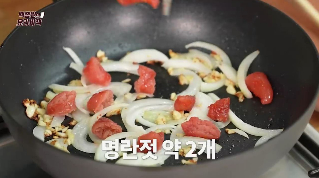 6. 마늘이 노릇하게 익으면 채 썰어둔 양파와 잘라둔 명란젓을 넣고 젓가락으로 살살 볶아주세요. 이때 명란젓이 터지지 않도록 조심하세요.