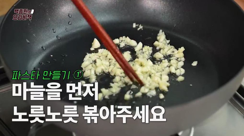 5. 이제 재료를 볶아줄 차례입니다. 프라이팬에 식용유를 두른 뒤, 마늘을 먼저 넣고 노릇하게 볶아주세요.