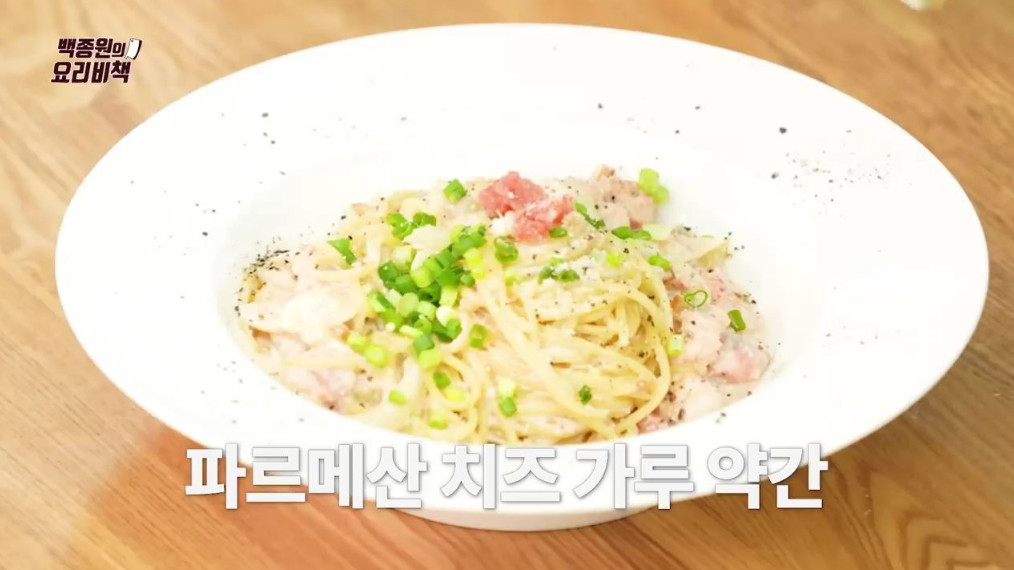 10. 마지막으로 쪽파를 두께 약 0.3cm로 송송 썰어 올리고, 후추와 파마산 치즈가루도 약간 뿌려주세요. 고명용으로 명란젓을 조금 올리면 더 맛있습니다. 쪽파 대신 파슬리 가루를 사용해도 좋아요.