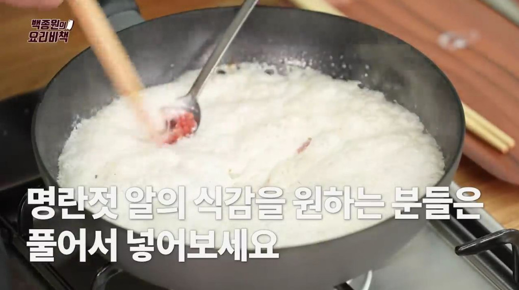 8. 여기에 삶아둔 면을 넣고 크림소스와 잘 어우러지도록 볶아주세요. 간은 맛소금으로 맞추면 되고, 취향에 따라 명란젓 알의 식감을 살리고 싶다면 명란젓을 풀어 추가로 넣어주셔도 좋습니다.