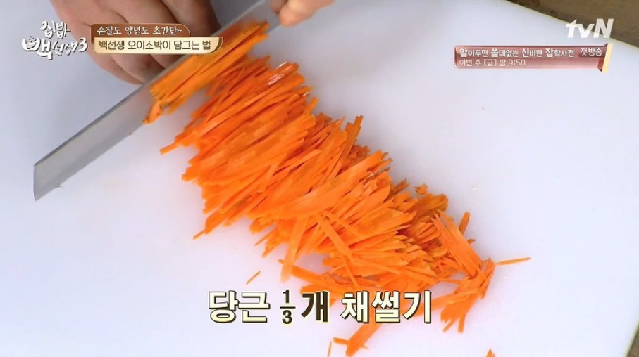7. 이제 추가로 들어갈 재료들을 손질해 주세요. 부추는 오이 칼집 속에 잘 들어가도록 잘게 썰어 주고, 당근은 꼭 넣지 않아도 되지만 색감을 살리기 위해 1/3개 정도 채 썰어 준비하면 좋아요. 이렇게 양념과 재료를 준비하는 동안에도 절인 오이를 자주 뒤적여 주세요. 자주 뒤적여 줄수록 오이소박이의 맛이 한층 더 좋아진다고 해요.