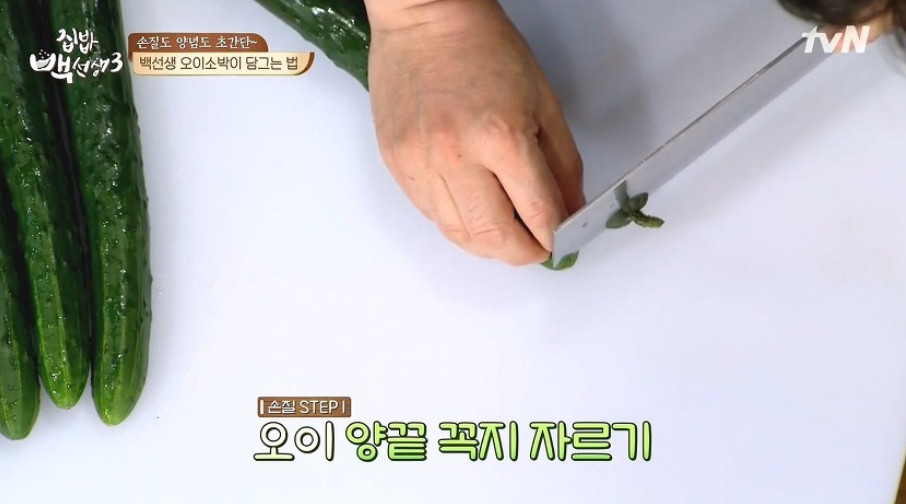 ※ 오이에 십자가 모양으로 칼집을 낼 때는 사진처럼 아랫부분을 집게로 잡고 해보세요. 이렇게 하면 칼이 너무 깊이 들어가지 않아 보다 쉽게 십자가 모양 칼집을 낼 수 있어요.