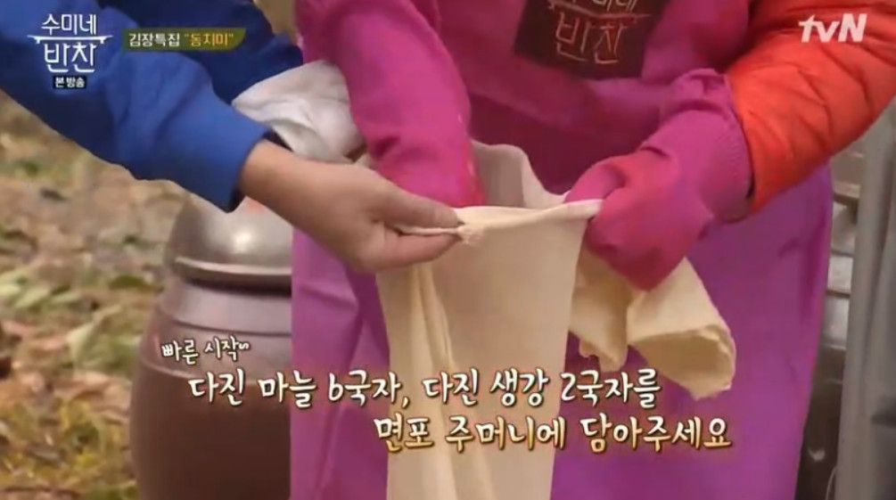 제일 먼저 다진 마늘 6 국자, 다진 생강 2 국자를 면포 주머니에 담아주세요.