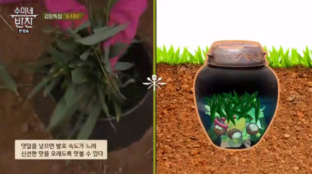 항아리 뚜껑을 덮기 전에 댓잎을 넣어주면 동치미의 발효 속도가 느려져서 신선한 맛을 오래도록 맛볼 수 있다고 하니 참고하시길 바래요.