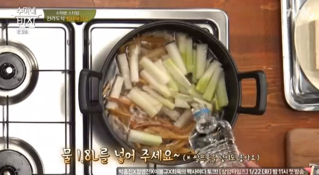 이후 물 1.8L를 넣어 주는데, 물 대신 쌀뜨물을 넣어도 맛있다고 해요.