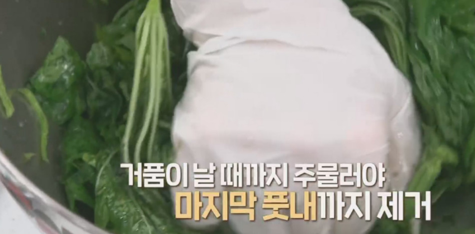 아욱을 물에 한 번 헹군 뒤 물기를 꽉 짜주세요. 이렇게 손질해야 아욱국을 끓였을 때 부드럽고 맛있어진다고 합니다.