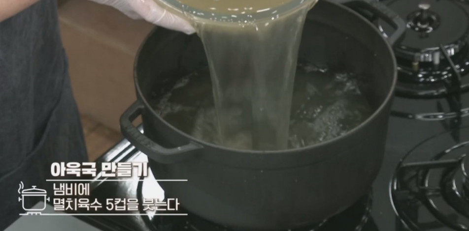 밑간을 위해 손질한 아욱에 국간장을 약간 뿌리고 섞지 않은 채 그대로 두세요. 그런 다음 냄비에 내장을 제거한 멸치로 끓인 멸치육수 5컵을 부어주세요.