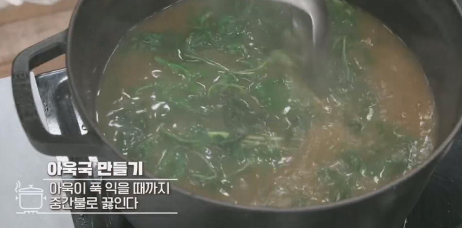 국물이 끓으면 밑간한 아욱을 넣고 중불에서 뭉근하게 끓여주세요.