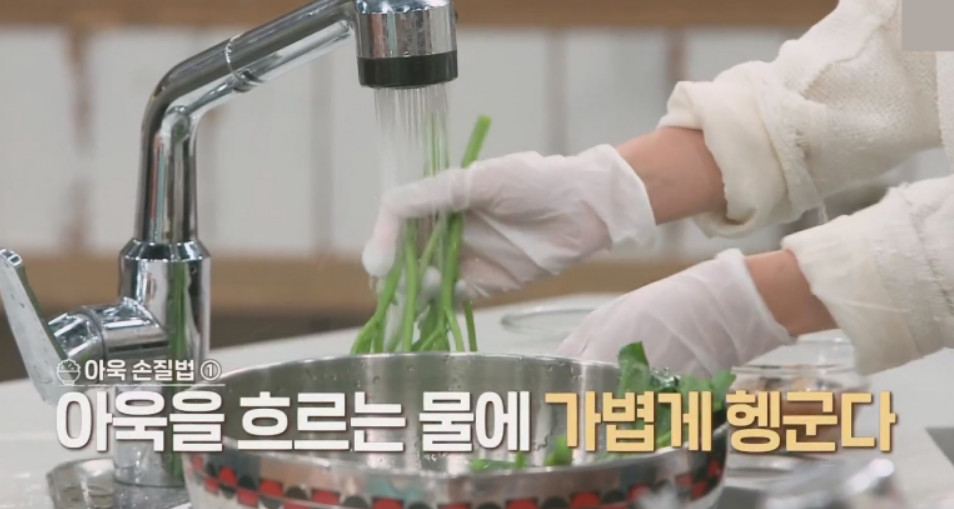 아욱은 물에 오래 담가두면 풋내가 나므로, 흐르는 물에 가볍게 씻어주세요.