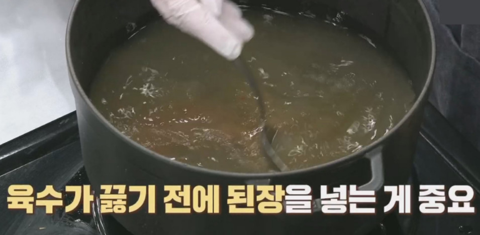 육수가 끓기 전에 된장 3큰술을 넣고 잘 풀어주세요. 빅마마 요리연구가님은 육수가 끓기 전에 된장을 넣어야 된장의 떫은맛과 잡내가 나지 않는다고 조언하셨으니 참고하세요.