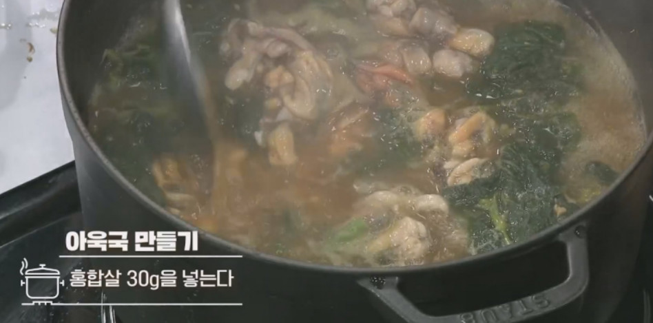 이제 홍합살 30g과 생새우 50g을 넣어주세요. 건새우를 사용해도 되지만, 생새우가 식감과 감칠맛이 더 좋다고 합니다. 개운한 국물 맛을 위해 여기서는 감자를 넣지 않았지만, 아욱국에 감자를 넣으면 아욱의 풋내를 잡아주는 효과가 있다고 해요.