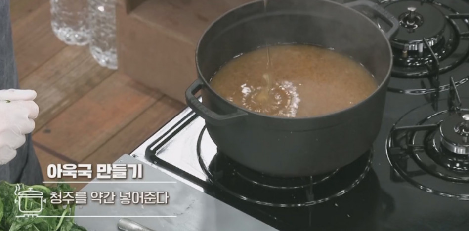 그런 다음 청주를 약간 넣어 된장의 뜬내를 잡아주고, 뚜껑을 열고 끓여 된장의 잡내가 날아가도록 해주세요.