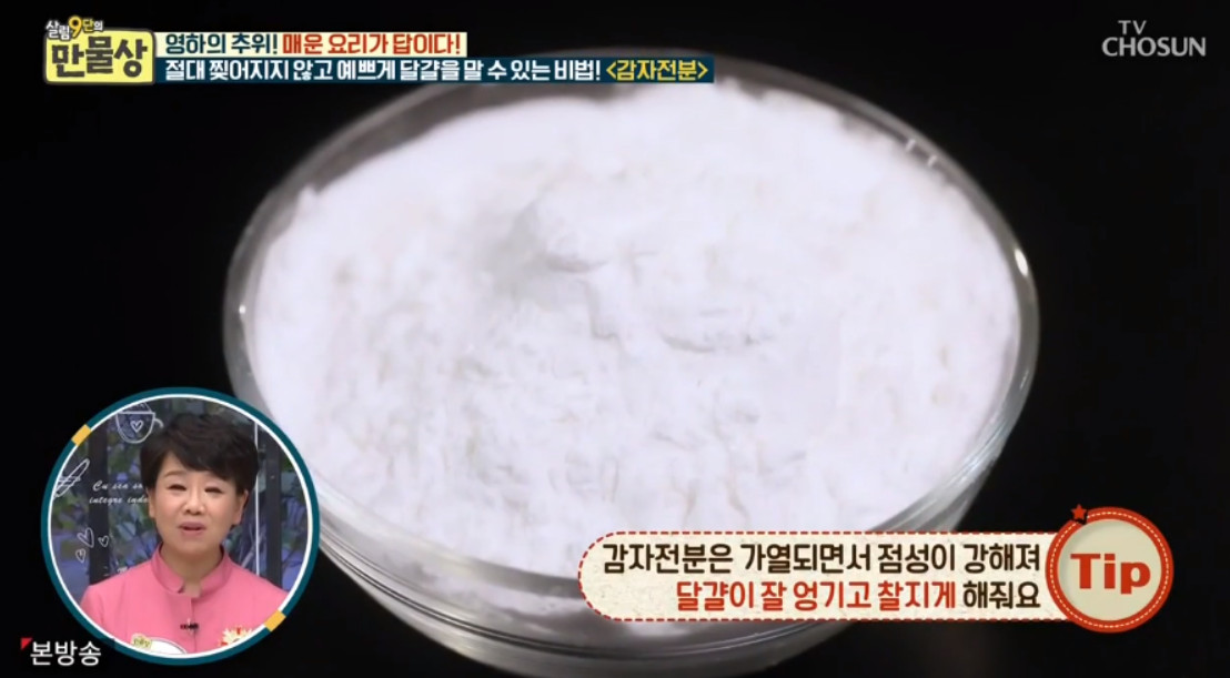 감자전분은 가열되면서 점성이 강해져 계란이 잘 엉기고 찰지게 해주기 때문에 감자전분을 계란말이에 넣으면 찢어지지 않고 탄력 있는 계란말이를 만들 수 있다고 해요.