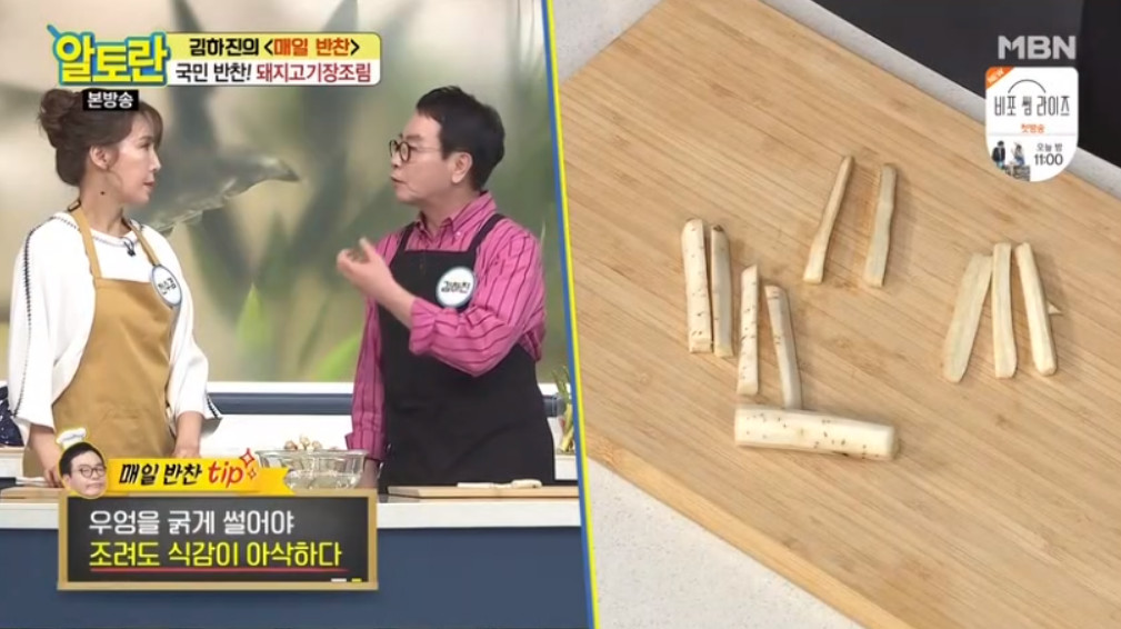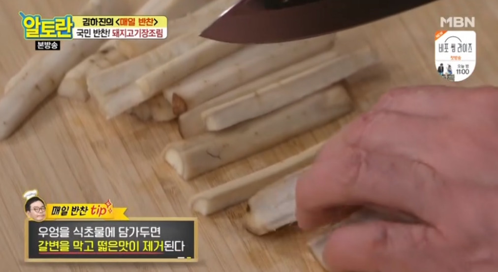 10. 오늘 레시피의 또 다른 비법! 바로 우엉입니다. 보통 돼지고기 장조림의 부재료는 메추리알이지만 김하진 선생님의 비법은 우엉을 넣는 거라고 해요. 이렇게 우엉을 넣게 되면 우엉의 향이 장조림에 배면서 고급스러우면서도 담백하고 깔끔한 맛을 낸다고 해요.
