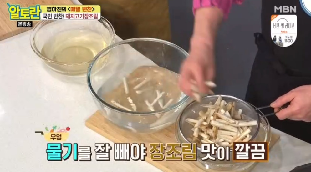 15. 냉수에 헹군 우엉을 체에 밭쳐 물기를 잘 빼주세요. 물기가 없어야 장조림 맛이 깔끔해진다고 해요.