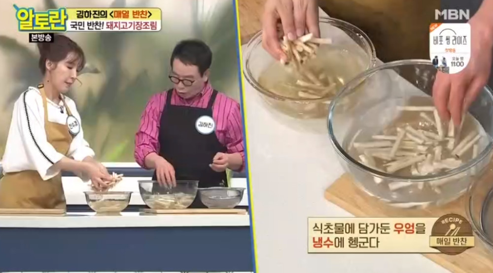 13. 한 가지 팁을 드리자면 손질한 우엉을 식초물에 5분 정도 담가두면 갈변을 막고 우엉의 떫은맛이 제거된다고 해요. 식초물은 물 10컵에 식초 1/2컵을 넣고 만드시면 됩니다.