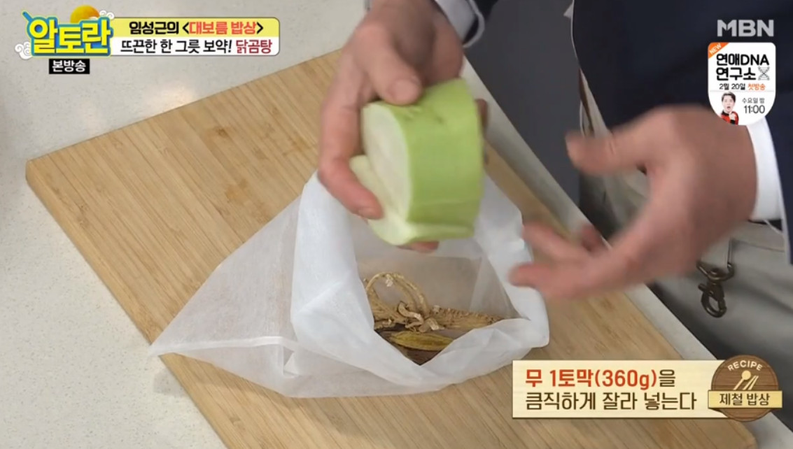 8. 육수팩에 무 1토막(360g)도 큼직하게 잘라 넣어주시고요.