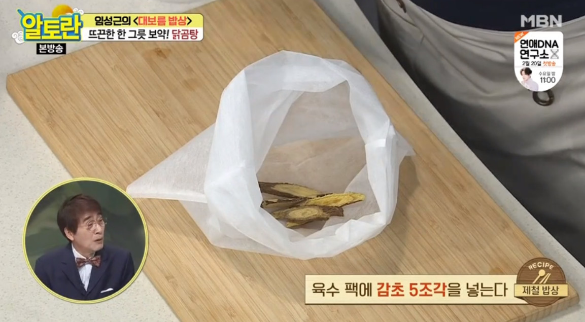 7. 육수팩에 감초 5조각, 황기 1 뿌리를 넣어주세요. 황기를 넣으면 감칠맛과 향을 더하고 닭의 잡내를 제거하는데 도움이 된다고 해요.