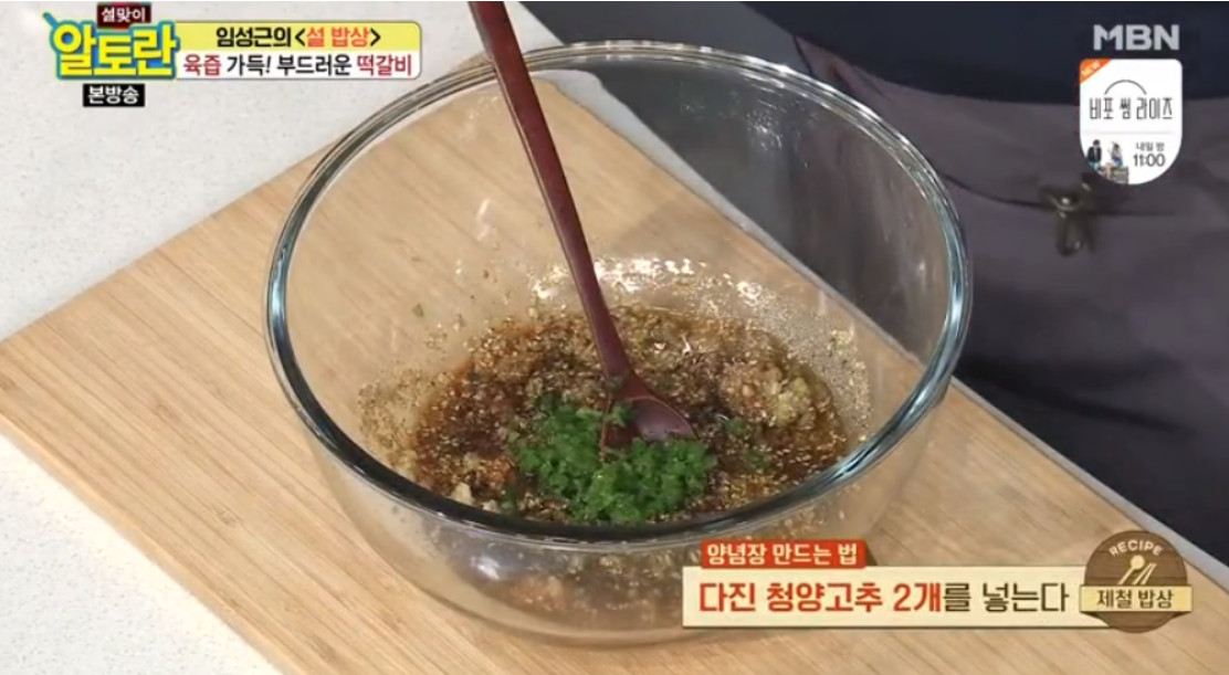 7. 거기에 느끼한 고기 맛을 잡고 질리지 않는 맛을 위해 다진 청양고추 2개와 식용유 3큰술도 넣어주세요. 이렇게 양념장에 식용유를 넣으면 고기가 부드러워지고 기름이 빠져나와 떡갈비가 담백해진다고 해요.