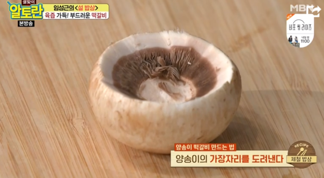 12. 취향에 따라 양송이 떡갈비도 만들 수 있어요. 우선 양송이의 가장자리를 도려내세요.