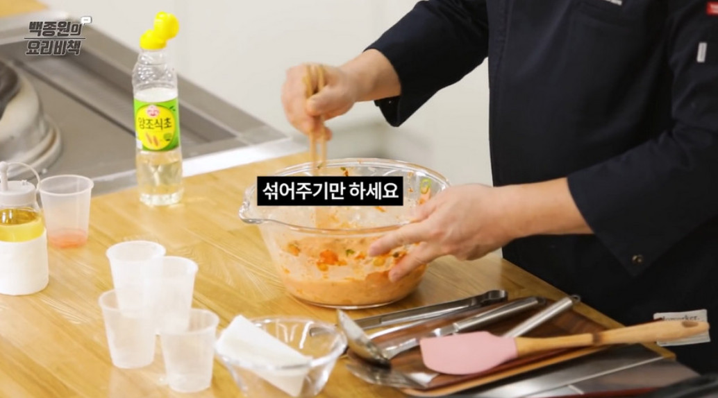 5. 준비한 재료들을 믹싱 볼에 넣고 잘 섞어주세요. 이렇게 하면 재료들이 균일하게 섞여서 맛있는 김치전을 만들 수 있어요.