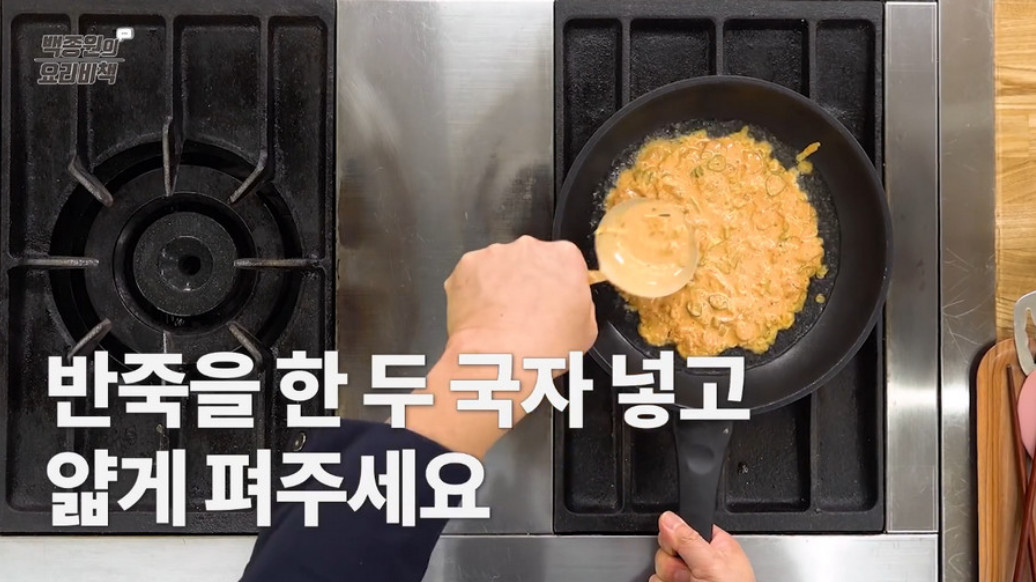 11. 기름을 넉넉히 두른 팬을 가열한 후, 반죽을 한 두 국자 정도 넣고 얇게 펴주세요. 이렇게 하면 김치전이 고르게 익어나가면서 바삭하고 고소한 맛이 살아나요. 한번에 너무 많이 넣지 않고 얇게 펴서 조리해주시면 좋아요.