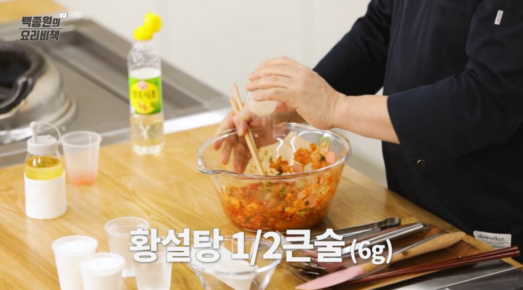 6. 색을 내기 위해 고운 고춧가루도 넣고, 김치의 시큼한 맛을 잡기 위해 황설탕도 넣어주세요. 설탕을 넣으면 전체적으로 감칠맛을 더해주는데 도움이 되니까, 넣는 게 좋을 거예요. 이렇게 조금씩 다양한 재료를 넣어서 풍부한 맛을 낼 수 있어요.