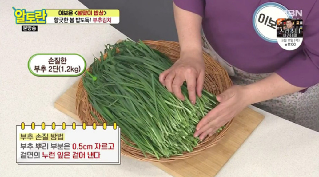 오늘은 이보은 요리 연구가의 부추김치 맛있게 담그는법을 소개해드리겠습니다. 사실 부추는 봄에 나는 것이 가장 좋다고 평가받는데요, 특유의 쌉싸름한 향과 단맛 덕분에 봄 부추는 건강에 아주 좋은 음식으로 여겨진답니다. 그래서 인삼과도 견줄 만하다고 할 정도예요.