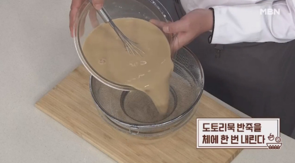 2. 도토리묵 반죽을 체에 한번 내려주세요. 이렇게 체에 내리면 도토리묵이 끓일 때 가루가 더 잘 풀려서 식감이 좋아진다고 해요.