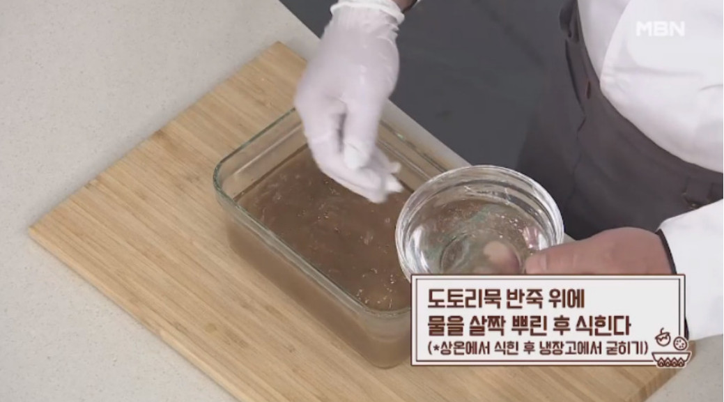8. 마지막으로 도토리묵 반죽 위에 물을 살짝 뿌린 후 식혀주세요. 이렇게 하면 도토리묵이 마르지 않아 질긴 부분이 생기지 않는다고 해요. 상온에서 식힌 다음 냉장고에서 굳히면 간단하고 맛있는 도토리묵이 완성됩니다.