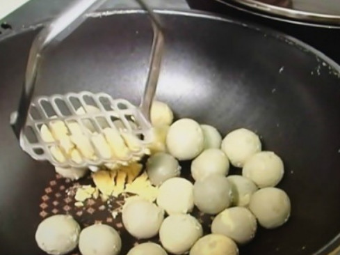2. 분리한 노른자를 으깬 후, 프라이팬에 넣고 약한 불에서 진한 갈색으로 변할 때까지 약 4시간 동안 볶아줍니다.