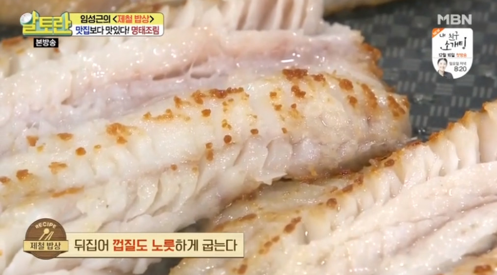 속살부분이 익으면 뒤집어서 껍질이 있는 등부분도 노릇노릇하게 구워주세요. 이렇게 명태를 조리기 전에 먼저 구워주시면 조릴 때 명태살이 부서지기 않고 고소한 맛이 증가되며 비린내도 제거된다고 합니다.