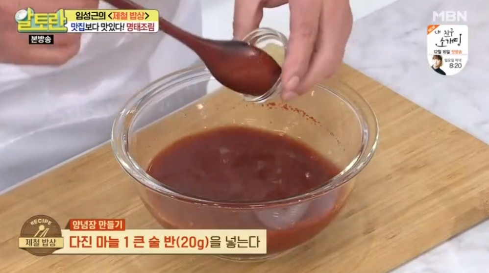 여기서 달인의 비법이 나오는데요, 바로 명태조림 양념장을 명태 대가리와 함께 한번 끓여주는거랍니다. 이렇게 하면 맛의 풍미가 훨씬 깊어진다고 해요. 끓이고 사용하는 것과 안끓이고 사용하는 것은 차이가 많이 난다고 하니 꼭 양념장을 한번 끓여주세요.