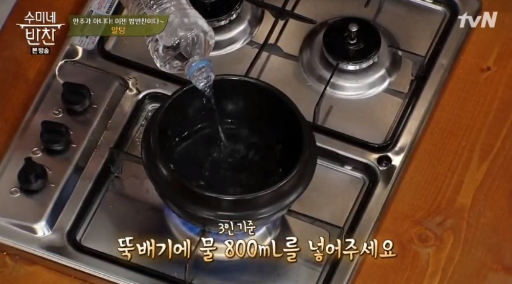 뚝배기에 물 800mL를 넣어주세요. 오늘 알려드릴 레시피는 3인 기준입니다. 무 → 콩나물 → 알(곤이) 순서로 넣어줄거예요.